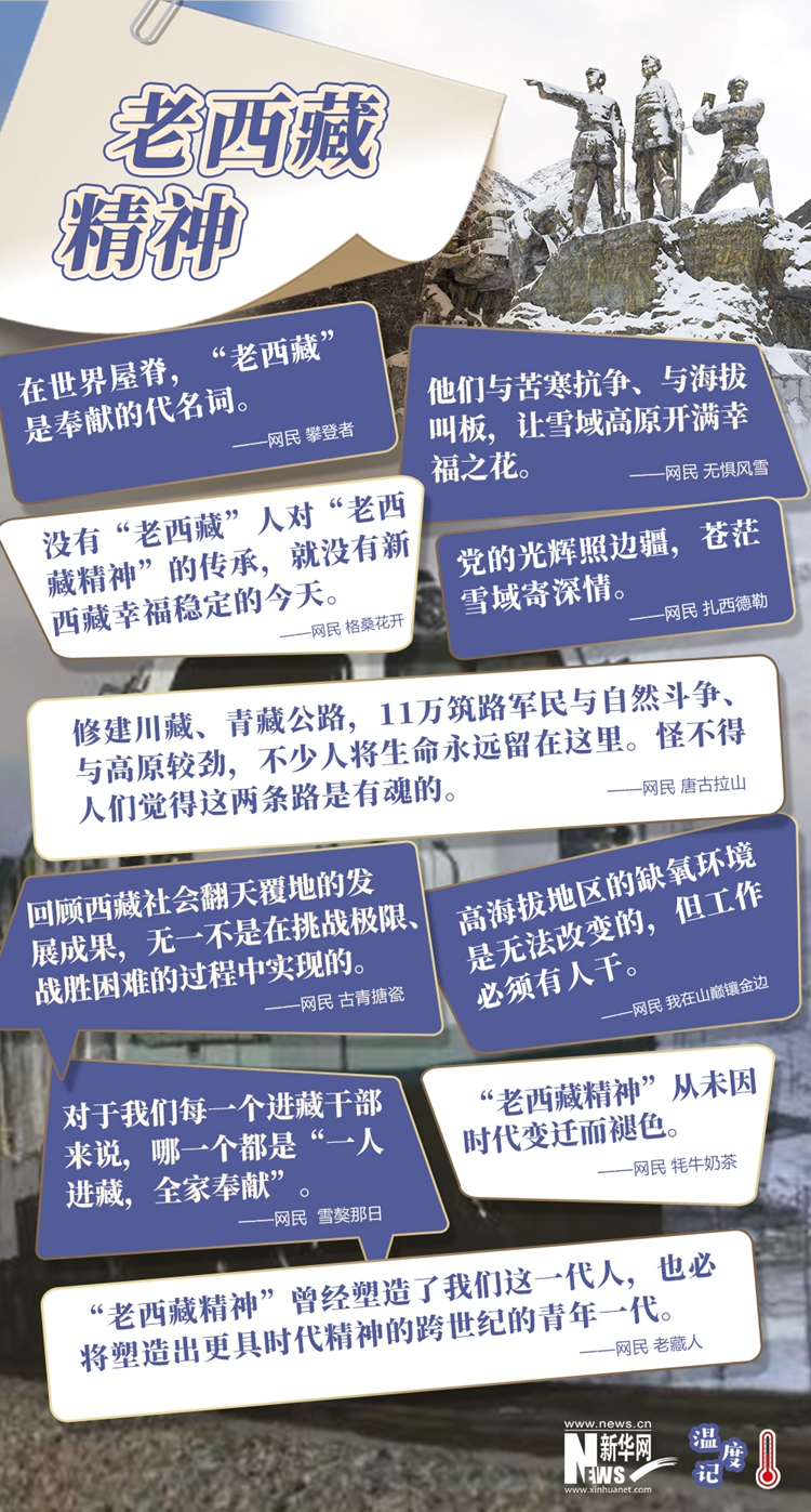 此后的幾十年間,一批又一批、一代又一代援藏干部、駐藏官兵踏上世界屋脊,扎根雪域高原,和當(dāng)?shù)厝罕娨坏?,推?dòng)西藏各項(xiàng)事業(yè)又快又好發(fā)展,讓千年雪域高原變了樣,也賦予“老西藏精神”更為豐富的時(shí)代內(nèi)涵?!吧谶@里很脆弱,生命在這里也很頑強(qiáng)?!本W(wǎng)民們?cè)谏缃黄脚_(tái)上表達(dá)對(duì)雪域高原心向往之的同時(shí),更不忘歌頌歷久彌新的“老西藏精神”。歷經(jīng)時(shí)代的變遷,這種精神正在感召并鼓舞更多人,扎根邊疆,造福西藏,讓那里的山水永遠(yuǎn)碧藍(lán)、綺麗,讓那里的土地永遠(yuǎn)充滿希望、幸?;ㄩ_。(文字:徐可 海報(bào)設(shè)計(jì):王曄)