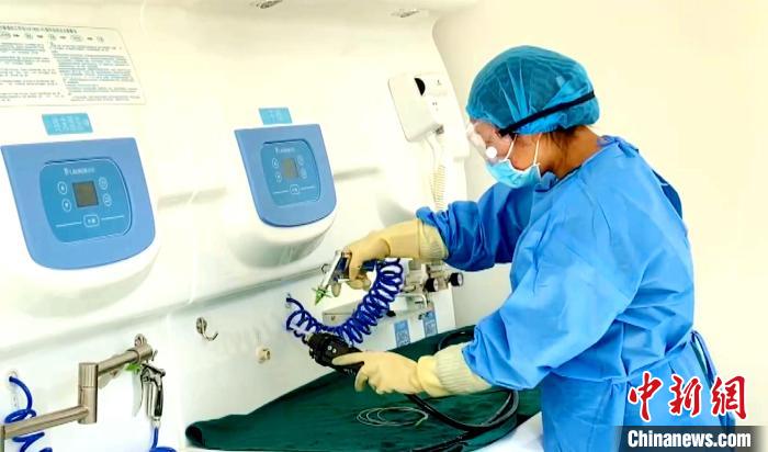 圖為醫(yī)生清洗設(shè)備。西藏康城腫瘤醫(yī)院供圖