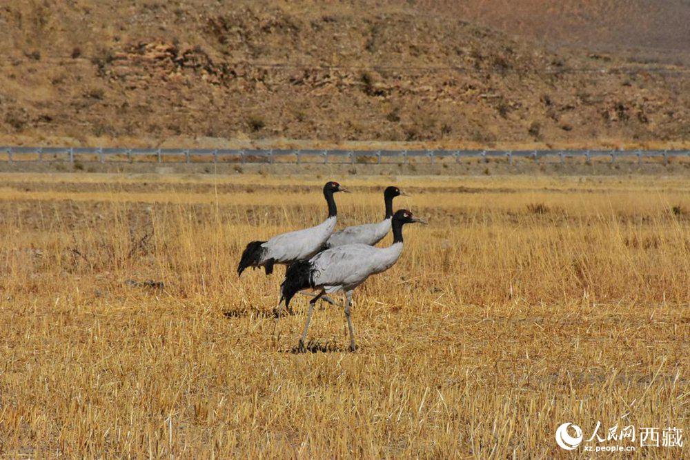 黑頸鶴在收割完的青稞地。人民網(wǎng) 李海霞 攝