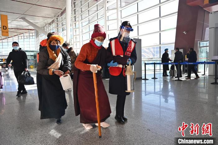圖為在拉薩貢嘎機(jī)場,多個臨時點(diǎn)位安排了志愿者為旅客提供服務(wù)。貢嘎來松 攝