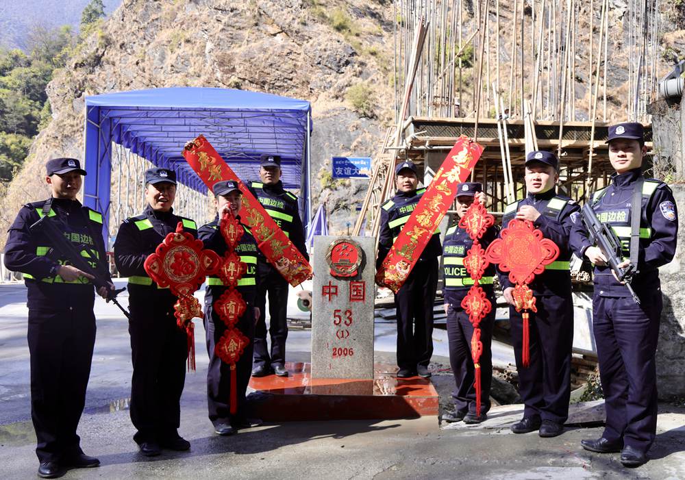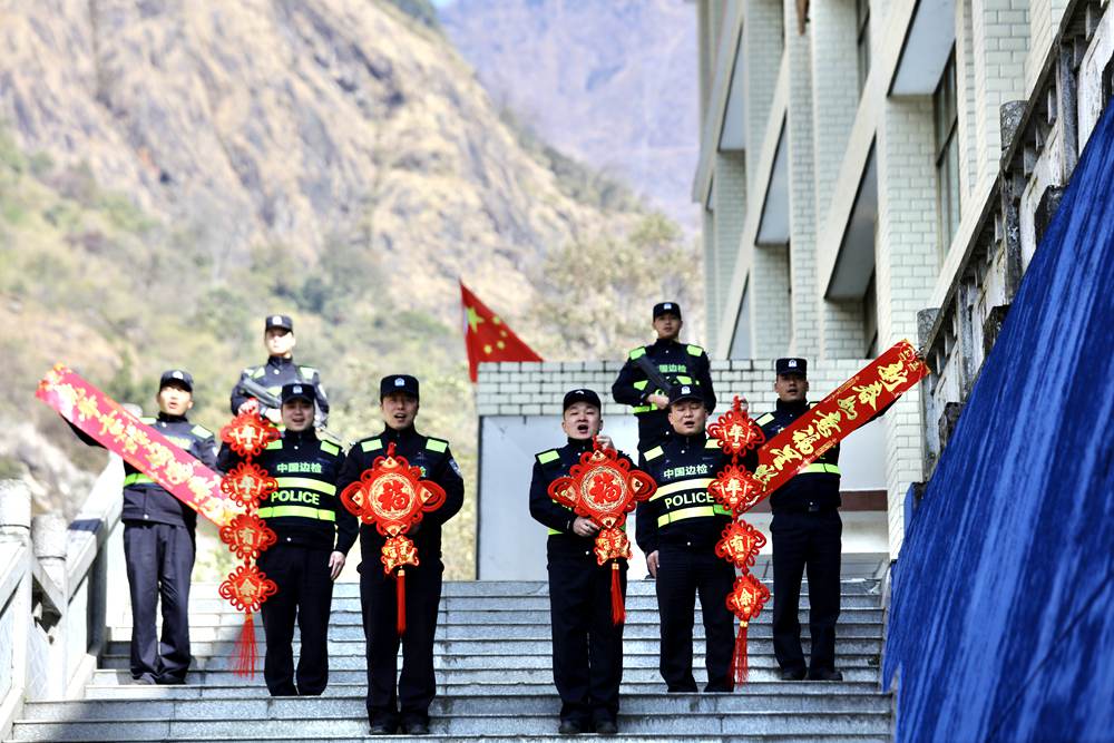 中尼友誼橋執(zhí)勤點(diǎn)民警向全國(guó)人民拜年。索朗次仁攝