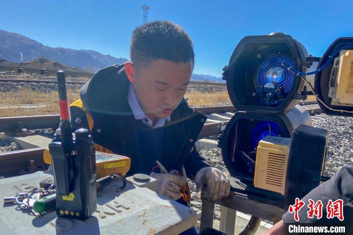 圖為劉興文在拉日鐵路測(cè)試信號(hào)機(jī)電燈電壓。 王來(lái)龍 攝