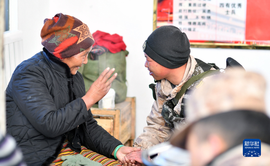 老阿媽達吉在和戰(zhàn)士聊家常(1月27日攝)。新華社記者 覺果 攝