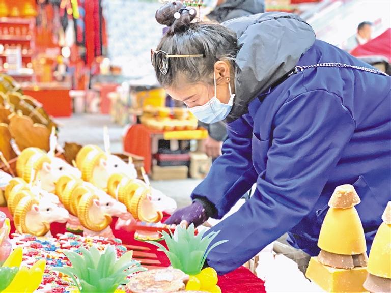 在雪域亙古浩瀚的歷史中,高原兒女自古以來便認(rèn)定“羊”是吉祥的動(dòng)物,代表了藏族群眾祈盼來年五谷豐登、六畜興旺。塑彩羊頭在藏語中稱為“隆果”,一般擺放在新年布置的貢品中央?!鞍謰屓ツ曩?gòu)買了一種用石灰制作的塑彩羊頭,今年我想購(gòu)買陶瓷制作的塑彩羊頭放在爸媽家,去年買的拿回自己家,這樣既環(huán)保,也讓老人開心?!笔忻袼骼释言谀曦洈偽毁?gòu)買“隆果”時(shí)說。