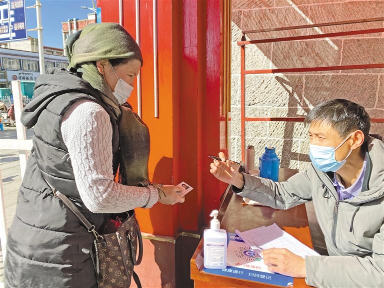 八廓商城市場(chǎng)部部長(zhǎng)卓嘎介紹說:“為廣大市民提供一個(gè)安全、祥和的購(gòu)物環(huán)境,我們?cè)谏虉?chǎng)設(shè)有5個(gè)進(jìn)出口,每個(gè)進(jìn)出口都需掃行程碼、測(cè)量體溫后才可進(jìn)入。因?yàn)橛行├先藳]有智能手機(jī),無法掃健康瑪,我們會(huì)登記姓名、身份證號(hào)、聯(lián)系方式。并且在增加的攤位旁增設(shè)消防器材,不定時(shí)巡邏?!?/p>