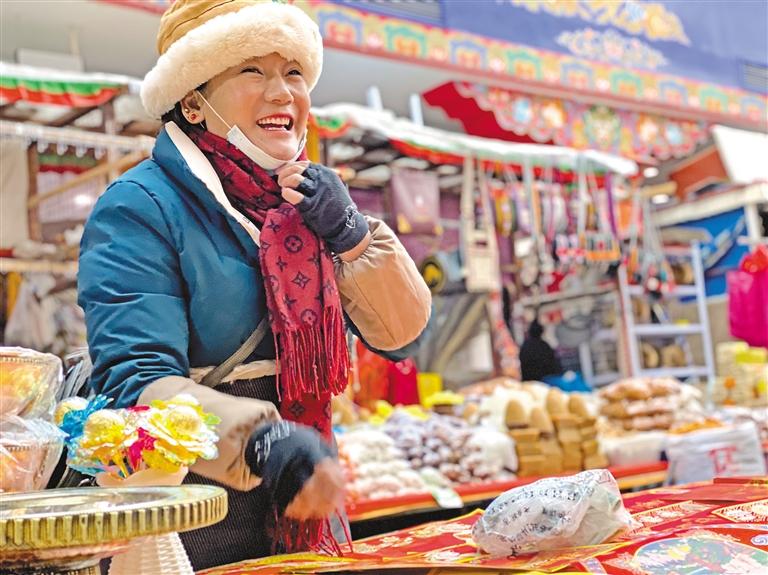 近年來,新春佳節(jié)貼“年紅”的傳統(tǒng)習(xí)俗日漸走進(jìn)圣城雪域。如今,無論城市還是農(nóng)村,幾乎家家戶戶都會(huì)在門上貼藏文春聯(lián),增加喜慶的節(jié)日氣氛。來自墨竹工卡縣的平措卓瑪正在八廓商城年貨攤位前整理著春聯(lián),去年已經(jīng)擺過一次年貨攤位的她,在1個(gè)月的時(shí)間里掙到了8000元。“今年攤位抽簽時(shí),心里特別緊張,怕位置不好,沒想到抽到了中間的好位置,這里采光足,紅彤彤的春聯(lián)在陽光下更好看了。新的一年,希望大家幸福安康、平安吉祥!”平措卓瑪懇切地說。