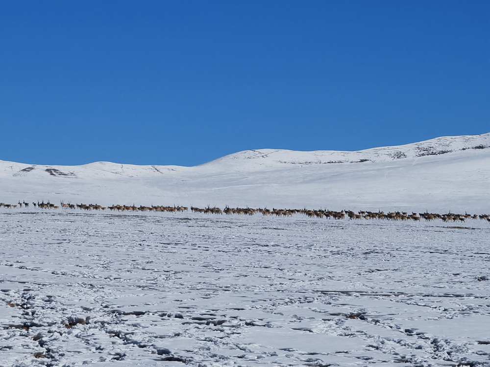 之后幾天,仁增羅布多次打電話向管護(hù)員詢(xún)問(wèn)情況,最終漸漸弄明白了情況——原來(lái),因?yàn)檫@些天的大雪,這些藏羚羊聚集到這片積雪較淺的草場(chǎng)上,就為了在這大雪天有一口食物。