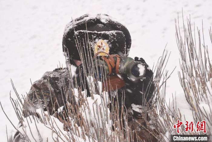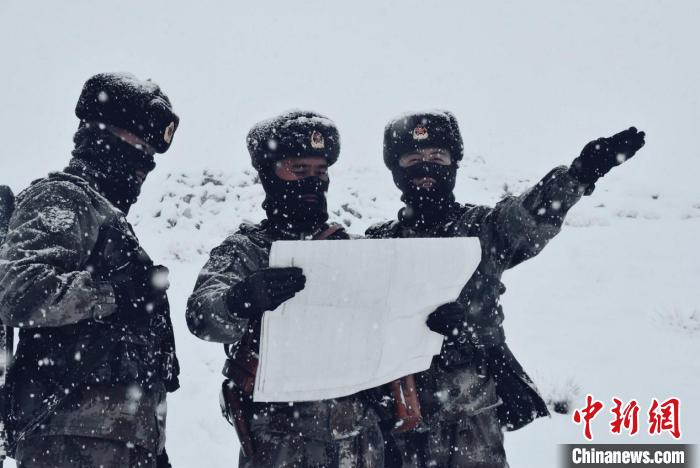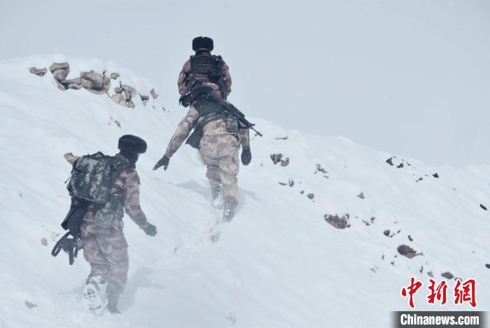 由于道路積雪較厚,車輛無法通行。官兵們采取徒步方式向點(diǎn)位前行,巡邏分隊(duì)在風(fēng)雪中艱難前行,隨著海拔的逐漸增加,氧氣愈發(fā)稀薄,此時(shí)的氣溫已經(jīng)接近零下30攝氏度。