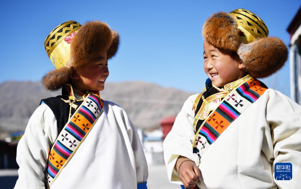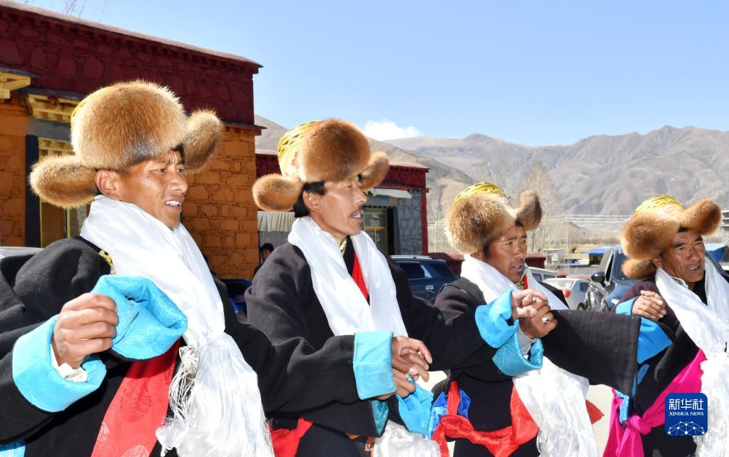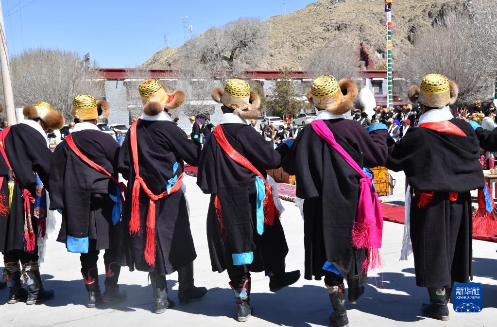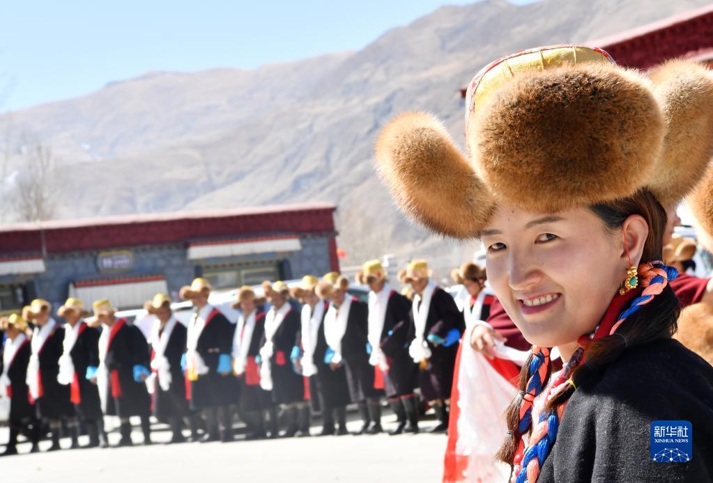 3月3日,西藏山南市貢嘎縣崗堆鎮(zhèn)農(nóng)民穿著嶄新的氆氌藏裝參加藏歷新年活動(dòng)。新華社記者 覺果 攝