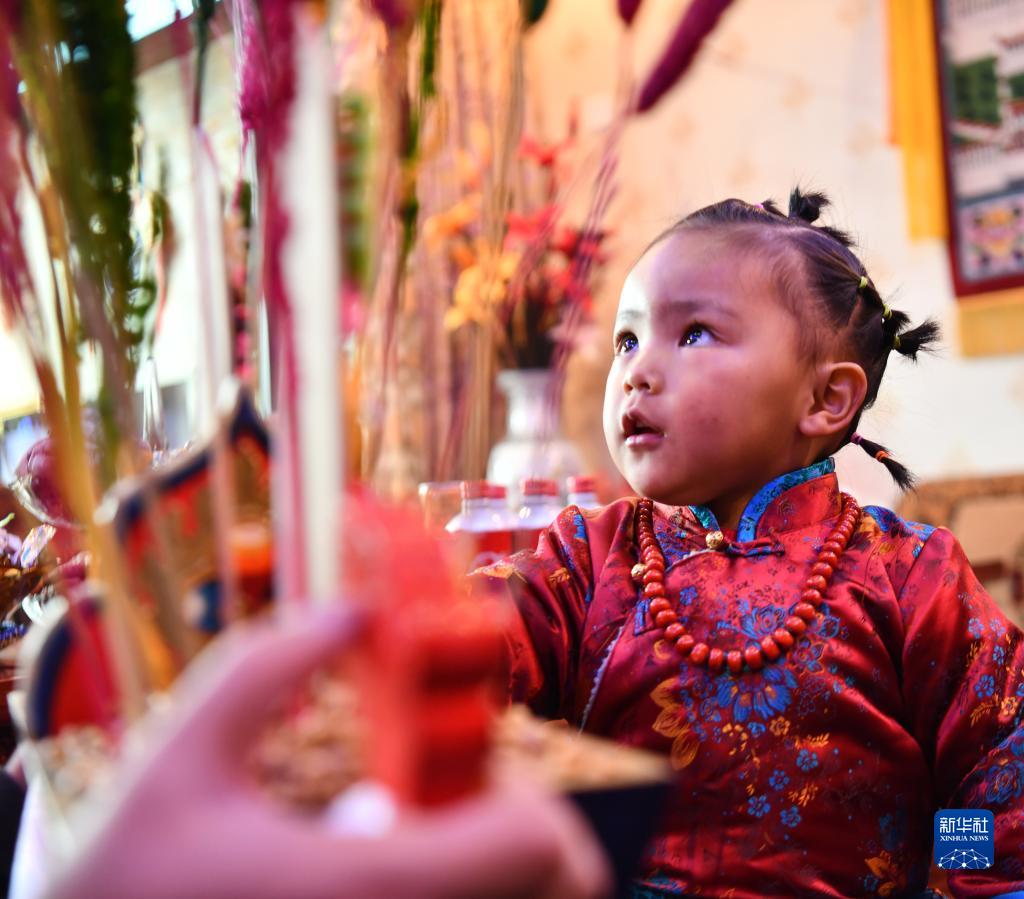 3月3日,在西藏拉薩,身著藏裝的小姑娘在吃“切瑪”。新華社記者 晉美多吉 攝