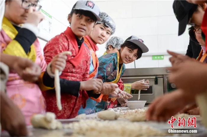 2017年2月25日,幾名藏族學(xué)生在制作“古突”。當(dāng)日,安徽省合肥市第三十五中學(xué)西藏班的藏族學(xué)生通過(guò)制作“古突”、表演文藝節(jié)目等方式,迎接藏歷火雞新年的到來(lái)。中新社記者 張婭子 攝