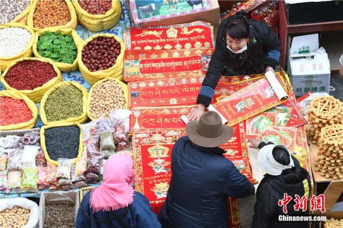 2021年2月,西藏拉薩,藏歷新年來(lái)臨之際,民眾選購(gòu)藏式春聯(lián)。中新社記者 貢嘎來(lái)松 攝