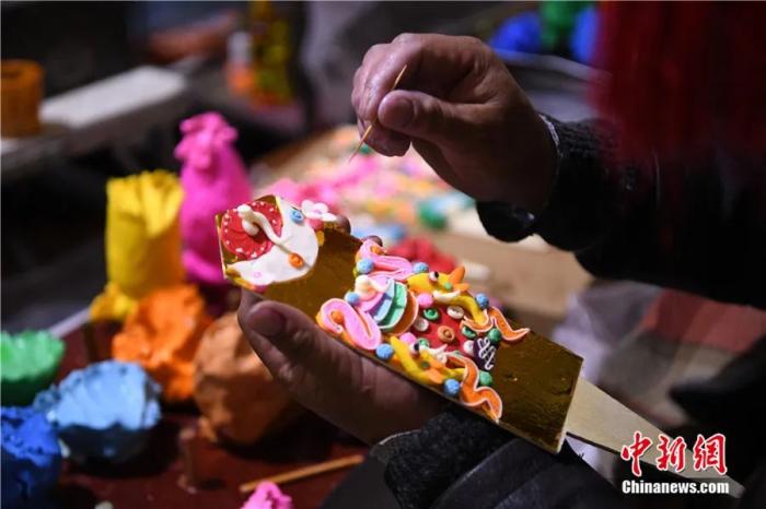 2022年2月14日,酥油花手工藝人在拉薩八廓古城現(xiàn)場(chǎng)制作。藏歷新年臨近,酥油花在年貨市場(chǎng)熱銷。酥油花在藏語(yǔ)中稱為“孜扎”,是古時(shí)藏傳佛教信眾因冬季沒(méi)有鮮花供佛而發(fā)明的替代品,如今已是藏族老百姓家庭中必備的年貨之一。中新社記者 貢嘎來(lái)松 攝