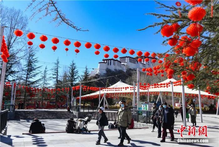 2022年1月29日,拉薩宗角祿康公園內(nèi),大紅燈籠高高掛起。隨著新春佳節(jié)和藏歷新年的臨近,古城拉薩大街小巷張燈結(jié)彩,洋溢著喜慶的節(jié)日氛圍。中新社記者 貢嘎來(lái)松 攝