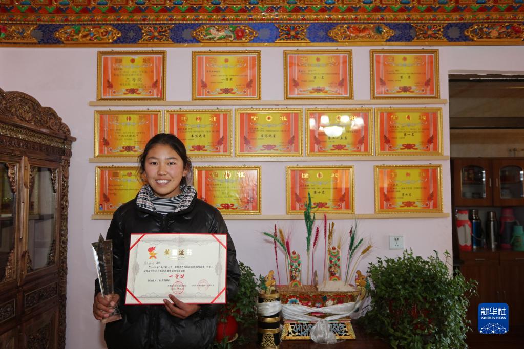 達(dá)瓦堅參的女兒普巴拉姆展示自己的獎狀(2022年2月23日攝)。新華社記者姜帆 攝