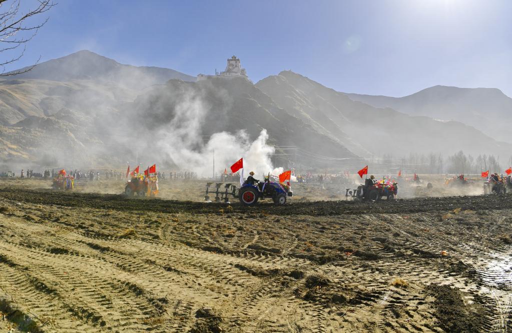 日頭漸高,春耕儀式準(zhǔn)備就位。門中崗社區(qū)黨總支書記央金卓嘎說:“開耕嘍!”頓時,14臺拖拉機(jī)發(fā)出隆隆轟鳴聲,肥沃的田地被犁出一道道深深的壟溝。