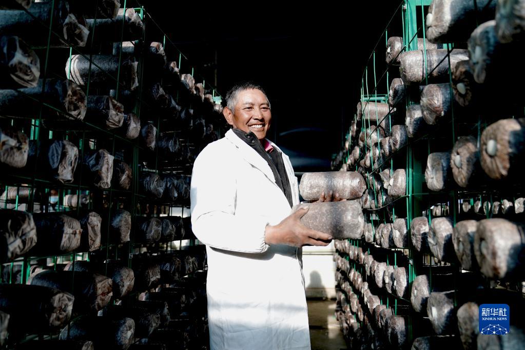 索珠村黨支部書記洛桑正在擺放菌包(2022年1月24日攝)。 新華社記者劉洪明 攝