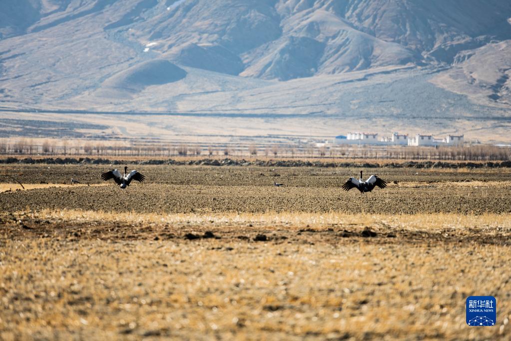 這是在西藏日喀則市桑珠孜區(qū)的農田里拍攝的黑頸鶴(3月12日攝)。新華社記者 周荻瀟 攝
