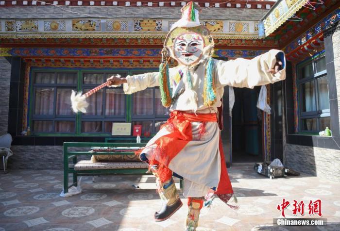 圖為3月21日,桑珠在自家院子里練習(xí)協(xié)榮“仲孜”。 中新社記者 貢嘎來松 攝