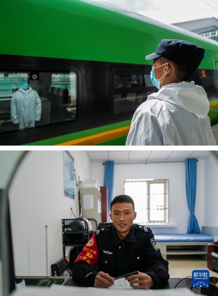 拼版照片:上圖為3月31日,白瑪旺扎在列車即將駛離車站時執(zhí)勤(新華社記者洛卓嘉措攝);下圖為白瑪旺扎在派出所接待窗口(新華社記者劉潁攝)。今年24歲的白瑪旺扎2021年8月起在林芝站派出所擔(dān)任輔警,他的家位于離車站3公里的麥巴村。鐵路的開通讓他解決了就業(yè),同時還能照顧家庭。新華社發(fā)