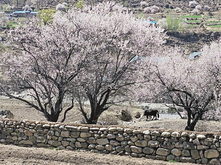 圖為尼屋鄉(xiāng)農(nóng)牧民養(yǎng)殖的牛在桃林里悠閑地散步。