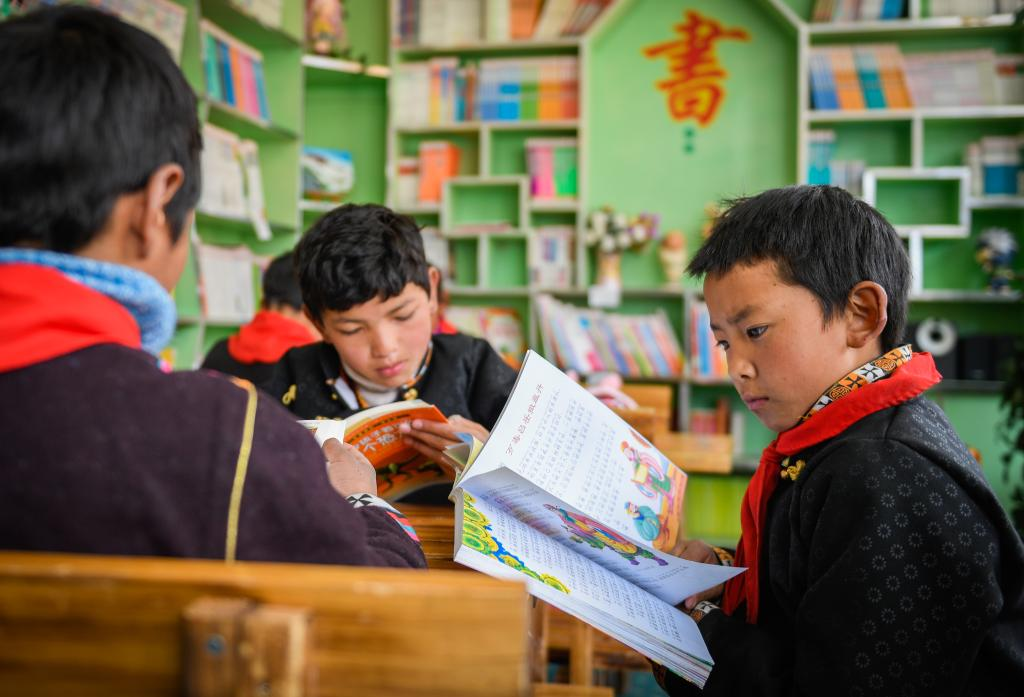 西藏林芝市工布江達(dá)縣仲莎鄉(xiāng)中心小學(xué)低年級(jí)學(xué)生在校圖書室內(nèi)閱覽書籍(2018年4月攝)。新華社發(fā)