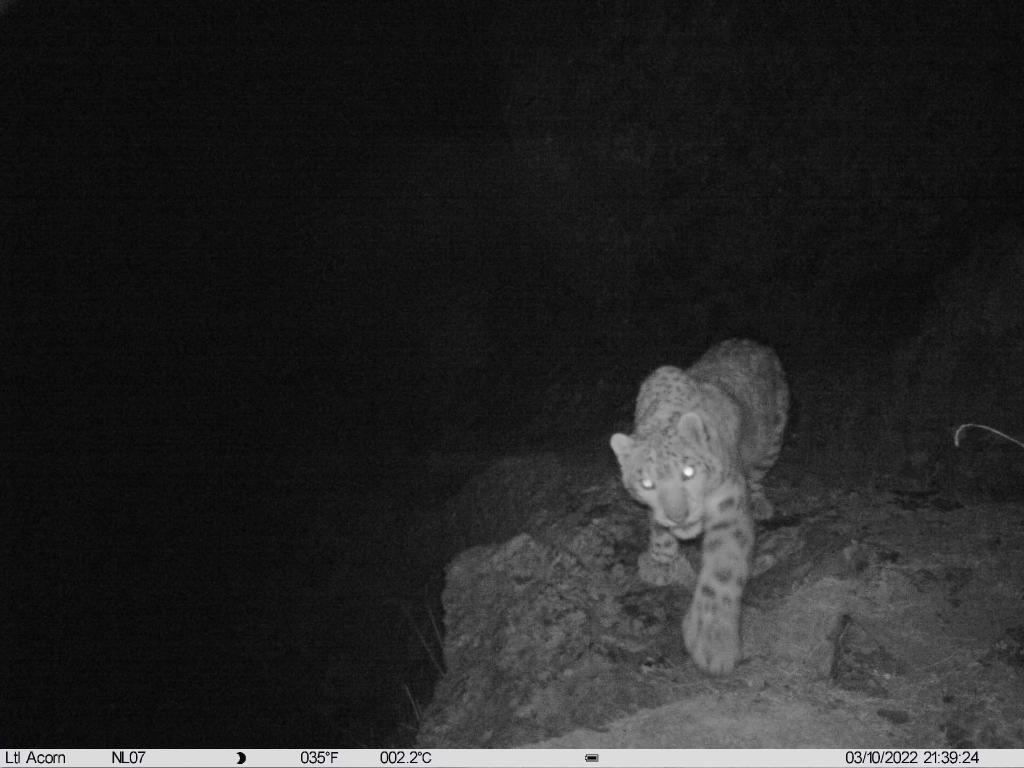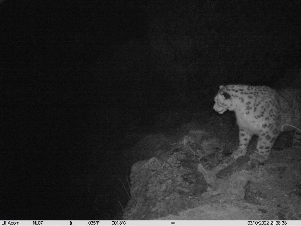 紅外相機監(jiān)測照片顯示,今年3月,一只成年雪豹走到了一臺位于山脊線上的紅外相機觸發(fā)裝置前,不斷地上前用鼻子觸碰,并且淘氣地在鏡頭前呼出了一股熱氣。