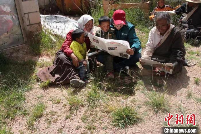 資料圖為益西卓嘎與雙湖縣牧民一起讀報。受訪者供圖