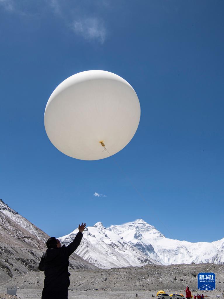 這是在珠峰登山大本營(yíng),科研人員施放的大氣臭氧探空氣球(5月3日攝)。新華社記者 孫非 攝