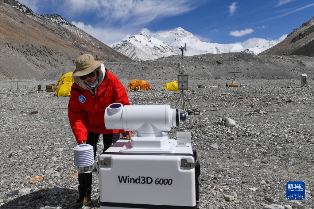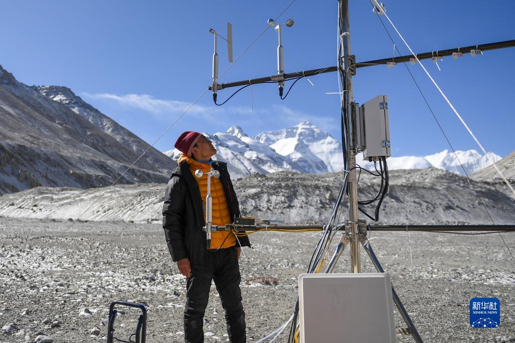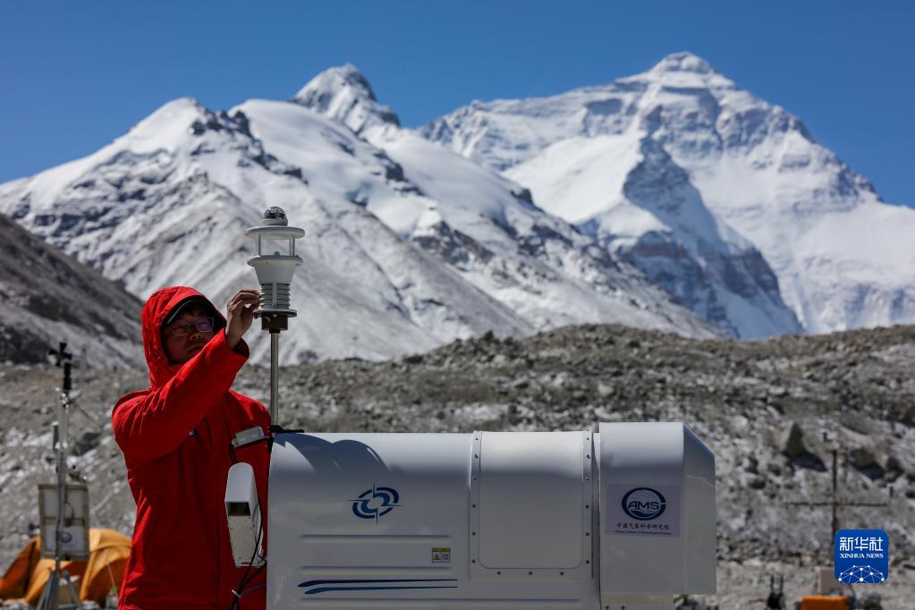 5月3日,在珠峰登山大本營,科研人員檢查臭氧通量裝置運(yùn)行情況。新華社記者 姜帆 攝