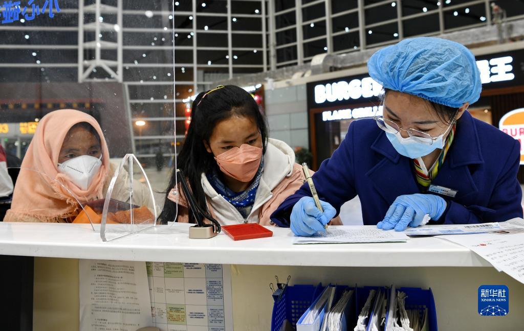 5月8日,在拉薩貢嘎機(jī)場(chǎng)候機(jī)樓,機(jī)場(chǎng)服務(wù)人員(右)為患兒和家人登記信息。新華社記者 張汝鋒 攝