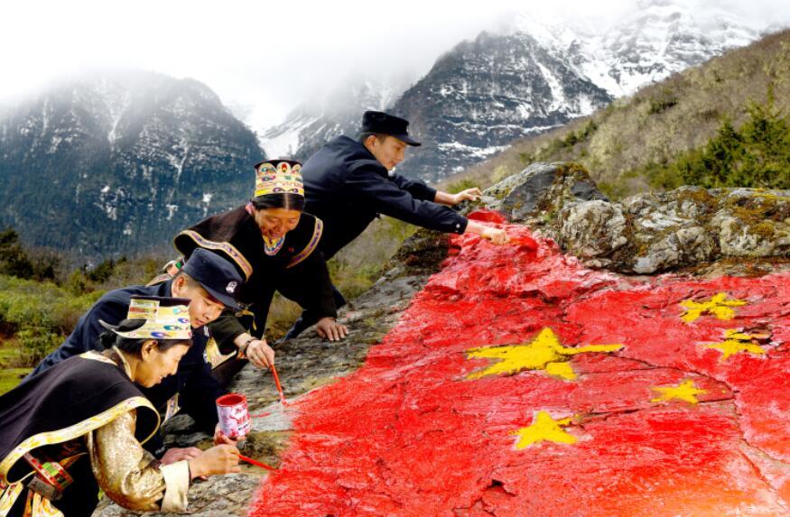 圖為玉麥邊境派出所戍邊民警與“時代楷?!鲍@得者卓嘎、央宗姐妹共同描繪國旗。蔣美靈 攝