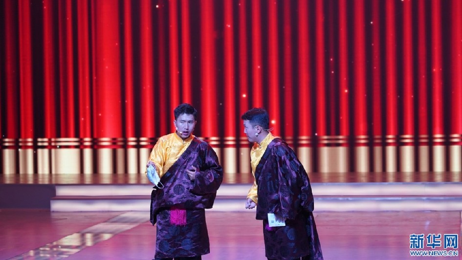 圖為晚會(huì)現(xiàn)場(chǎng)相聲表演《防疫從我做起》(5月31日攝)。新華網(wǎng)發(fā) 貢桑央吉(實(shí)習(xí)生)攝