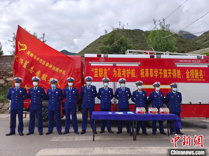圖為消防指戰(zhàn)員為考生設(shè)立志愿服務(wù)點??ㄈ魠^(qū)森林消防中隊 攝