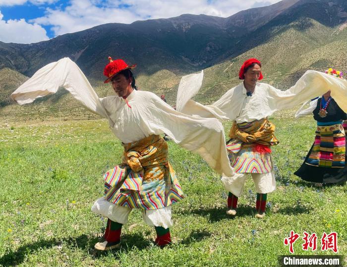 6月末,西藏拉薩市林周縣唐古鄉(xiāng)綠草如茵,草地上點(diǎn)綴著藍(lán)色和黃色的野花。央吉卓瑪和鄉(xiāng)親們以藍(lán)天白云為幕,伴隨著清脆悠揚(yáng)的笛聲,跳起了熱振曲卓。歡快舒展的舞姿、恢弘嘹亮的唱腔,仿佛把人帶入悠久的歷史中。