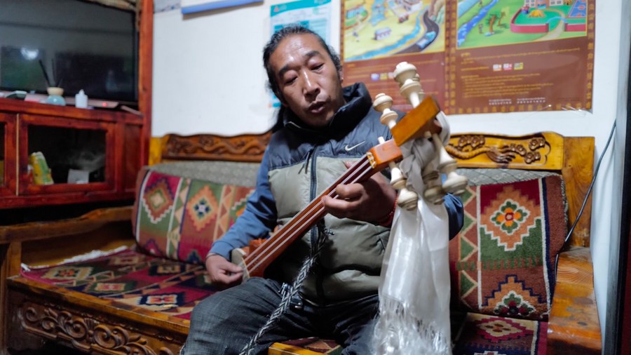 絨轄鄉(xiāng)居民扎西次仁在位于陳塘村的自家甜茶館里彈奏扎念琴(4月10日攝)。新華社記者 劉潁 攝