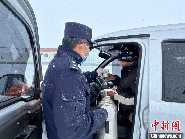 圖為馬攸橋邊境檢查站民警為滯留旅客提供開水。馬攸橋邊境檢查站 攝