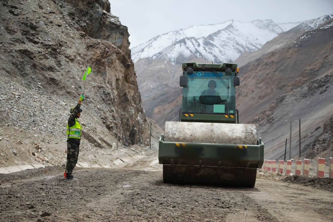 在相隔數(shù)百公里外的麻扎達(dá)坂路段,官兵們面臨的又是另一番景象,他們冒著嚴(yán)寒降雪天氣搶修沉降路基道路,現(xiàn)場分工后,隨后對兩端道路實施安全警戒,并做好過往群眾安撫解釋工作。指揮員高效指揮,操作手協(xié)同配合,安全員實時觀察山體情況,峽谷間機械馬達(dá)轟鳴、濃煙滾滾。2小時后,一段200多平方米的路基水穩(wěn)層全部鋪設(shè)完成,官兵們有序指揮車輛通行,司機分別鳴笛揮手向筑路兵致敬。