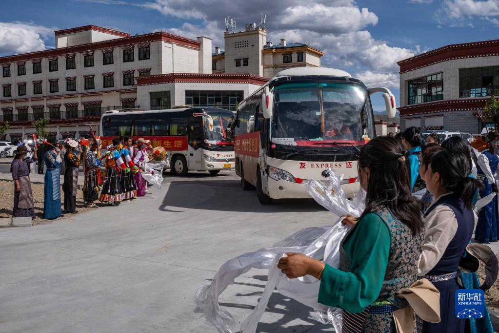 在森布日安置點(diǎn),西藏山南市貢嘎縣的群眾歡迎遠(yuǎn)道而來(lái)的搬遷群眾(7月19日攝)。新華社記者 孫非 攝