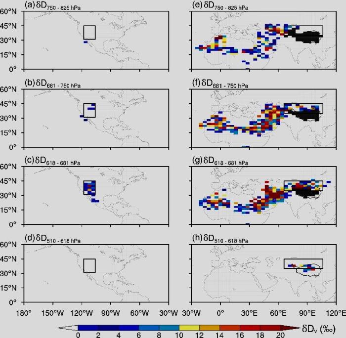 目前,不同地表介質(zhì)中穩(wěn)定同位素出現(xiàn)“反高程效應”的原因仍然不明。對此,中外合作研究團隊發(fā)現(xiàn),在美國西部和亞洲干旱區(qū)(從紅海到青藏高原北部)等地區(qū)對流層中層的水汽穩(wěn)定同位素也類似存在“反高程效應”,而且其空間分布格局與地表介質(zhì)中穩(wěn)定同位素“反高程效應”的空間分布格局基本一致。