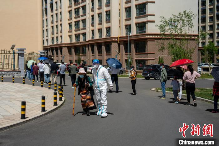 圖為8月12日,拉薩一小區(qū)內,工作人員攙扶藏族老人進行核酸檢測?!〗w波 攝