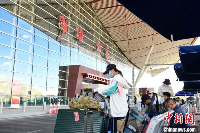 圖為8月11日,拉薩貢嘎機(jī)場(chǎng)航站樓外的旅客?!∝暩聛?lái)松 攝