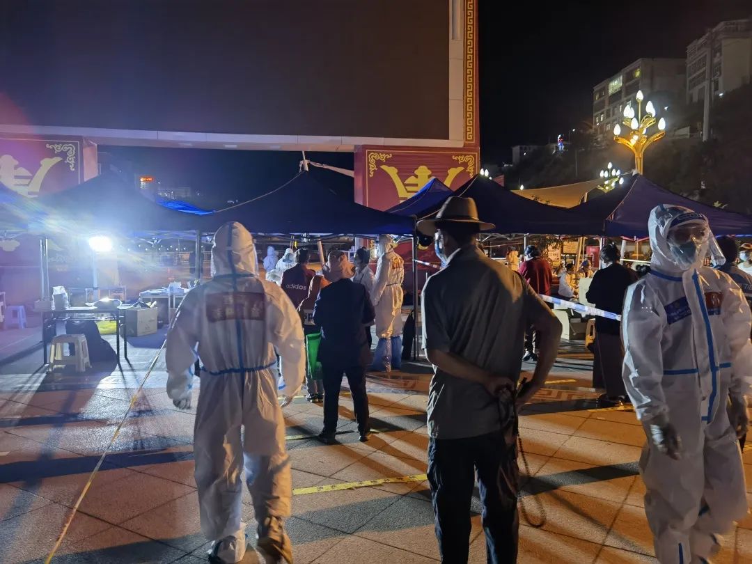 “為了您的安全,請保持1米以上間隔,謝謝。”晚上9點多,在茶馬廣場,支隊三級消防士張興梁,依然堅守在抗疫一線,維持著排隊做核酸的長隊。從早上7點開始,張興梁和其他消防隊員已堅守了14個多小時?!拔鞑貢円箿夭钐卮螅滋旆雷o(hù)服里面衣服都濕透了,但是到晚上這個點已經(jīng)干了,正好不用換衣服了?!睆埮d梁打趣的說到。