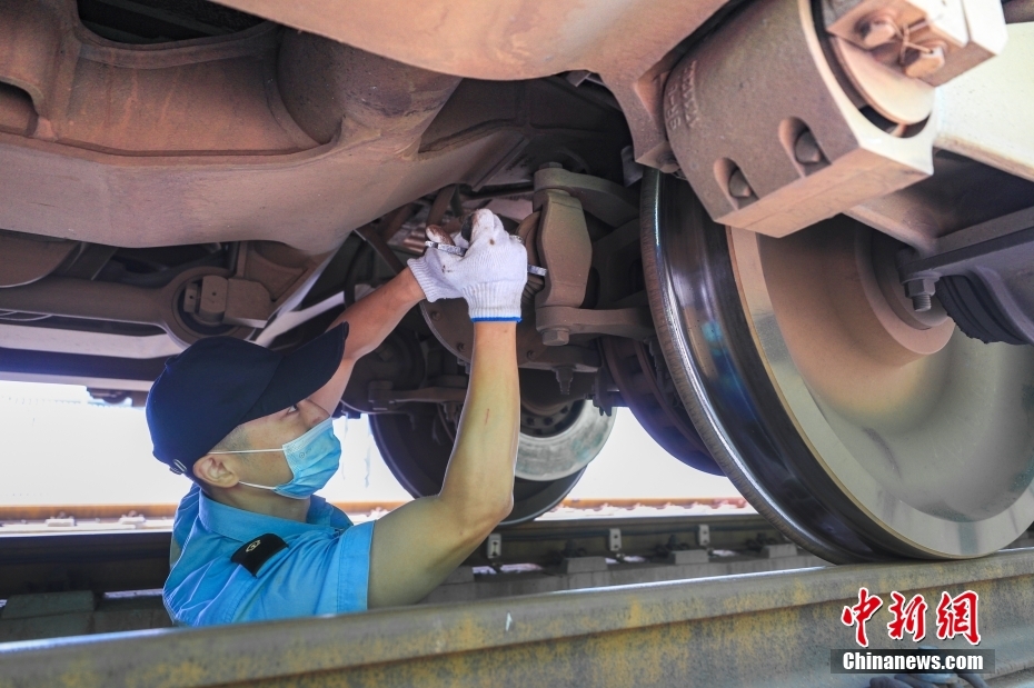 8月17日,北京車輛段北京西庫檢車間內(nèi),檢修人員對時(shí)速160公里動(dòng)力集中型復(fù)興號動(dòng)車組(俗稱“綠巨人”)的走行部進(jìn)行檢修。這里是京津冀地區(qū)唯一的“綠巨人”檢修維修基地,肩負(fù)著18列共計(jì)261節(jié)車輛的檢修任務(wù)。隨著暑運(yùn)逐漸迎來返校返程高峰,檢修人員也在加班加點(diǎn)為列車做好體檢工作,確保運(yùn)行安全。 中新社記者 賈天勇 攝