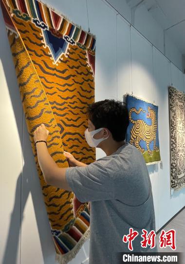 展廳中央地板上,90*190厘米的各色藏毯相連鋪開,這是藏族民眾最常用的、鋪在床鋪上的尺寸;兩旁墻上,懸掛多幅圖案復雜精細的大尺寸掛毯,這是重于藝術(shù)性的現(xiàn)代創(chuàng)作:好似唐卡的財寶天王掛毯、讓人有油畫錯覺的珠穆朗瑪峰風景掛毯……另有一張長逾1米的虎毯,主色深黃、虎紋考究,上下兩端織有七彩紋飾,非常搶眼。若將虎毯翻轉(zhuǎn),還會發(fā)現(xiàn)反面亦是清晰齊整的虎紋,與正面幾無差異。