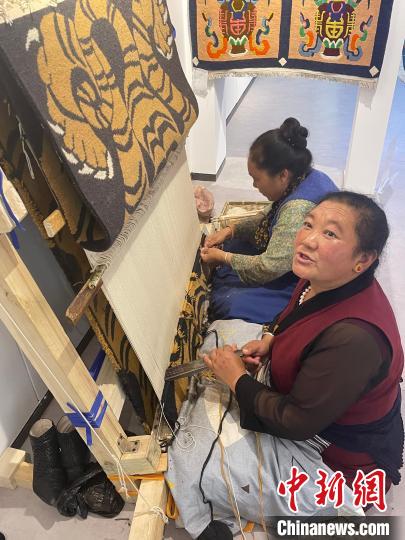 圖為在展廳中兩位藏族阿佳正一邊編織藏毯,一邊經(jīng)過工作人員翻譯與觀展者聊天。李晗雪 攝