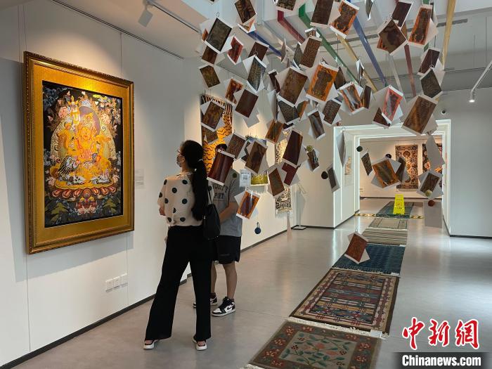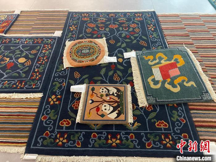 圖為展廳中展示的傳統(tǒng)藏毯及創(chuàng)新設(shè)計的坐墊大小的藏毯。李晗雪 攝