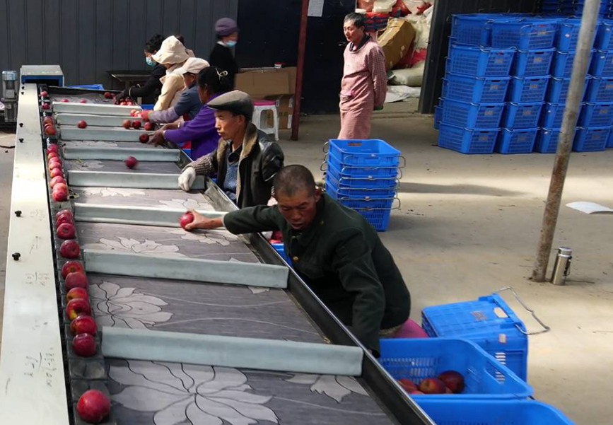 走進果園,昔日凹凸不平的塊狀農(nóng)田上,整齊排列的果樹一眼望不到頭,枝頭上的蘋果更是一茬接一茬的生長,有的深紅、有的淺紅、有的還泛青、有的則包著保護袋等待采摘,它們沉甸甸的,是果農(nóng)們致富的現(xiàn)實圖景。幾十名當(dāng)?shù)卮迕裾诠麍@里忙碌著,有的在清除雜草、有的在采摘、有的在做防護,分工有序,干勁十足。