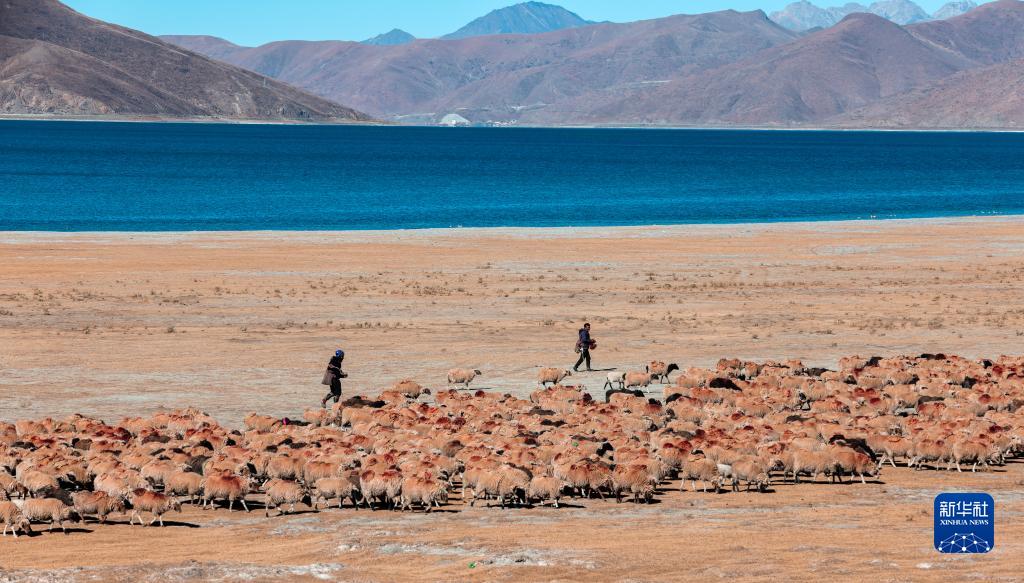 牧民在羊卓雍錯湖邊放羊(12月11日攝)。新華社記者 姜帆 攝
