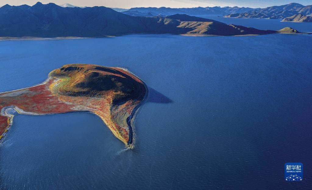 這是夕陽下的羊卓雍錯(12月11日攝,無人機照片)。新華社記者 姜帆 攝